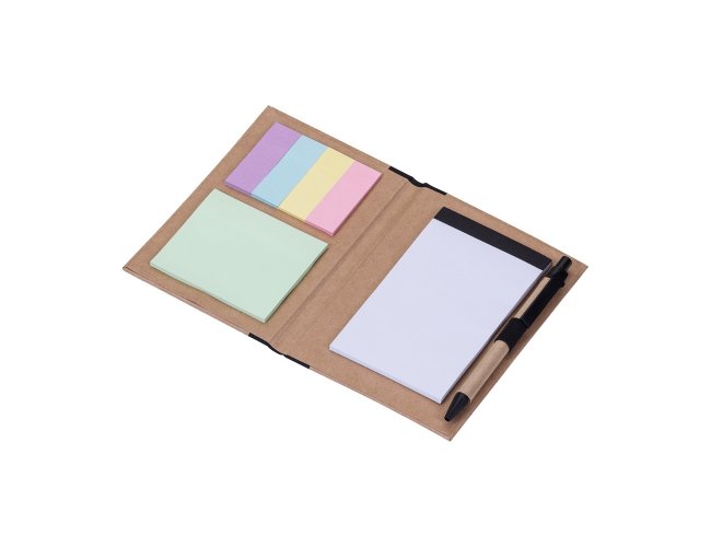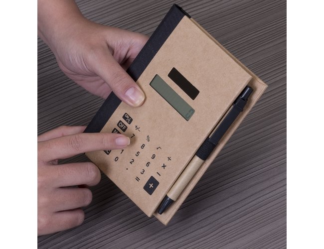 Descrição: Bloco de anotações ecológico com capa calculadora solar de 8 dígitos acoplada. Possui quatro blocos autoadesivos com aproximadamente 25 folhas cada, bloco verde com aproximadamente 25 folhas, bloco branco de rascunho com aproximadamente 30 folhas sem pauta e suporte elástico com caneta ecológica de papelão com clip e ponteira plástica preto.