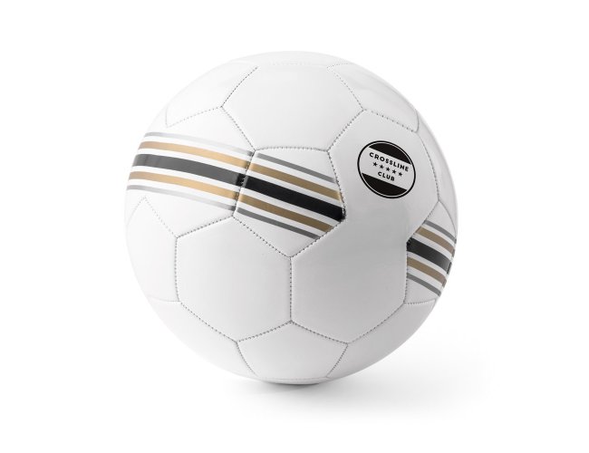 Bola de futebol em PVC com linhas pretas, douradas e prateadas.