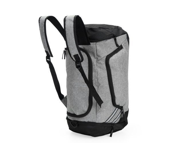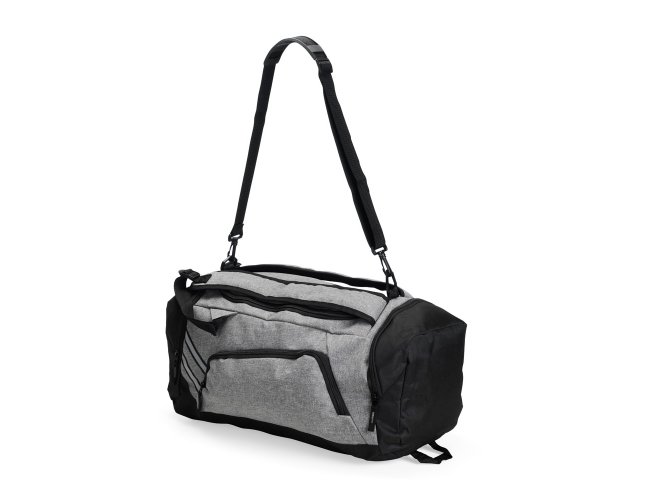Descrição: Bolsa de viagem confeccionada em poliéster resistente à água e capacidade para até 32 litros. Possui alças ajustáveis e acolchoadas para as costas, o que permite seu uso também como mochila. Além do compartimento interno principal, conta com três bolsos externos, incluindo um dedicado para tênis. Acompanha alça transversal removível.