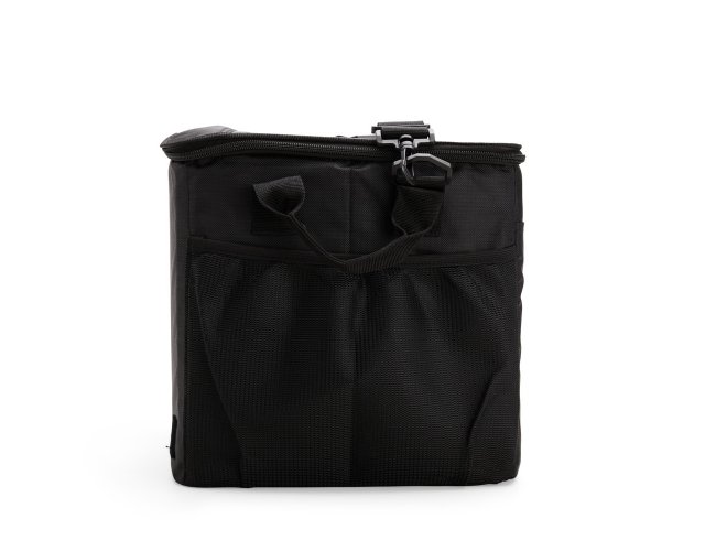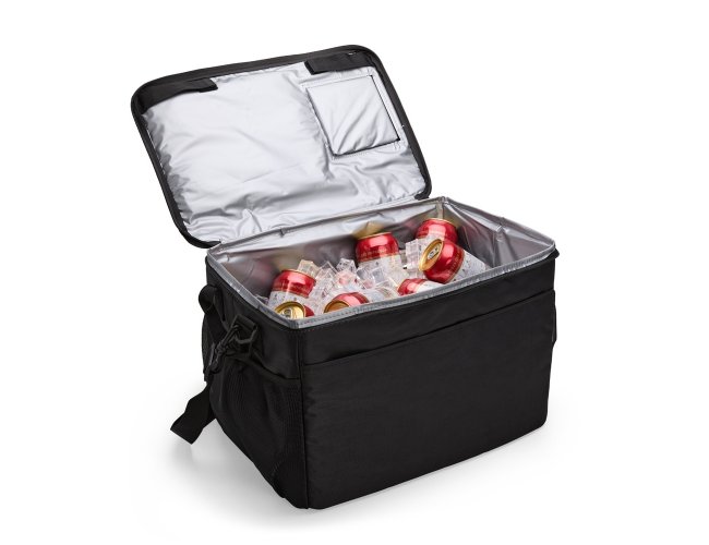 Descrição: Bolsa térmica confeccionada em poliéster 840D resistente à água e capacidade de até 33 litros. Possui revestimento térmico interno em PEVA atóxico, estrutura dobrável reforçada e tampa rígida em plástico PP com espaço para copos e abertura com fechamento em velcro. Conta ainda com três bolsos externos: um frontal com fechamento em velcro e dois laterais em tela de nylon com elástico. Acompanha alça transversal ajustável com apoio para ombro.