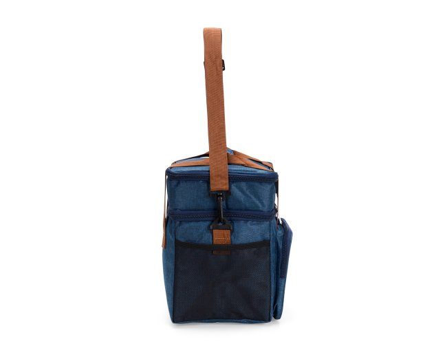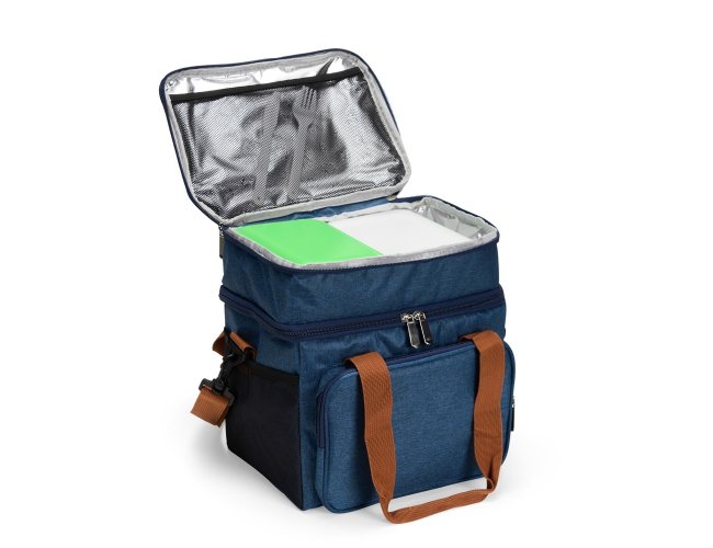 Descrição: Bolsa térmica dupla em poliéster 300D resistente à água e capacidade total de 15 litros. Possui dois compartimentos térmicos: um inferior, com revestimento em PEVA soldado (não vaza) que comporta até 9 litros e outro, em alumínio, com espaço para até 3 litros.. Conta ainda com bolso frontal, bolsos laterais em tela, alças de mão com suporte de juntura e alça transversal regulável e removível.