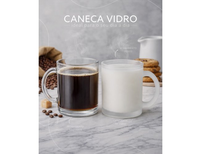 Descrição: Caneca em vidro com acabamento fosco e capacidade para até 350ml.