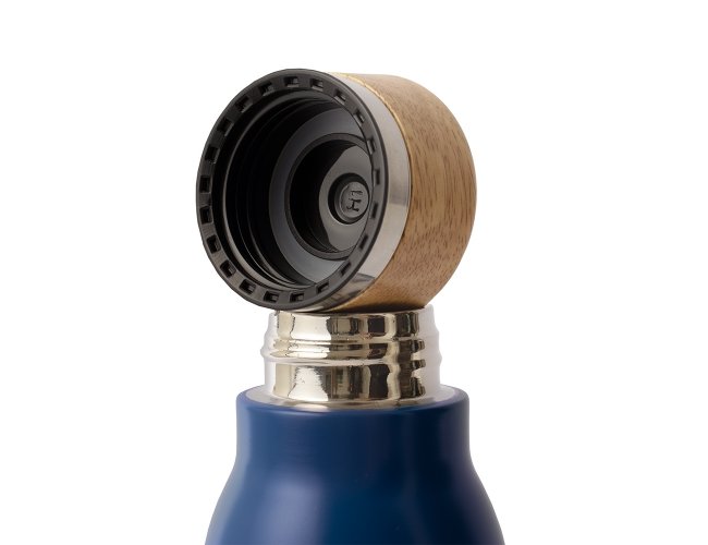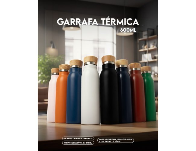 Descrição: Garrafa térmica feita em inox com pintura em spray, tampa rosqueável em bambu e capacidade máxima de 600ml. Possui estrutura de parede dupla e isolamento a vácuo, permitindo manter a temperatura de líquidos por mais tempo.