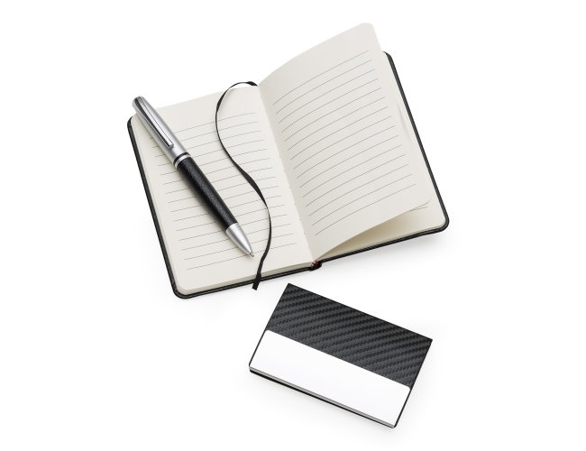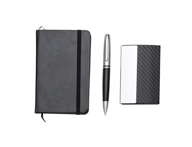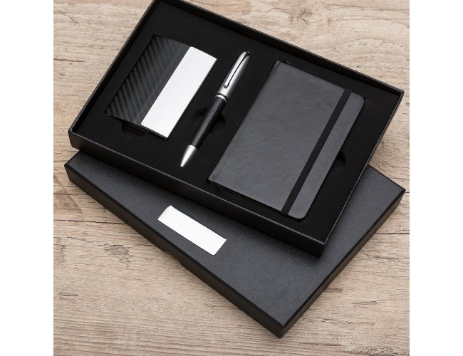 Descrição: Kit executivo 3 peças em estojo de papelão com tampa e parte interna revestida de espuma. Contém: porta cartão de couro sintético texturizado com detalhes prata brilhante, caneta metal fosca com detalhe emborrachado preto, caderneta em couro sintético com aproximadamente 80 folhas amarelas pautadas. Acompanha placa metálica para gravação.