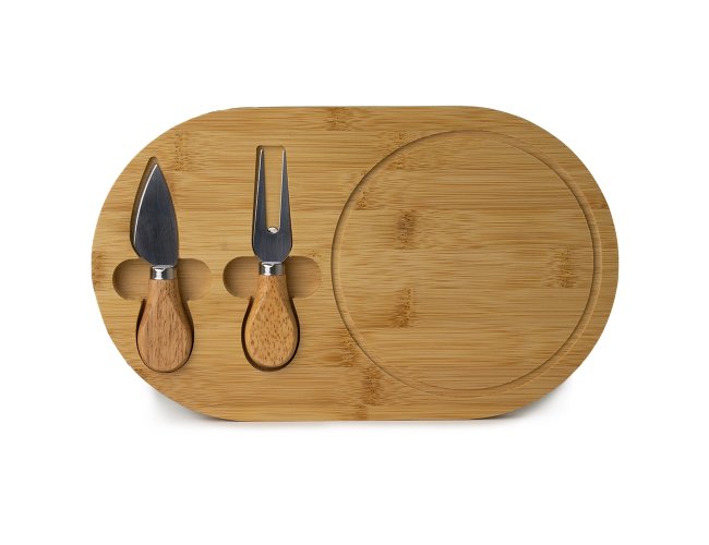 Descrição: Kit queijo 3 peças, contém: tábua de bambu com canaleta, faca com ponta e garfo. Tábua com imã para encaixe e fixação dos utensílios.