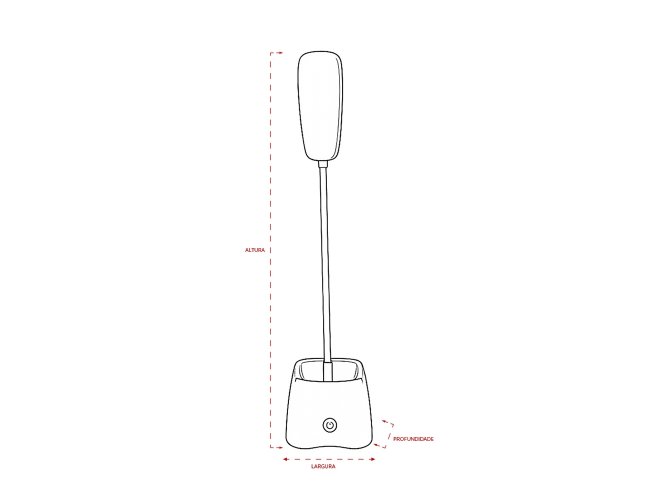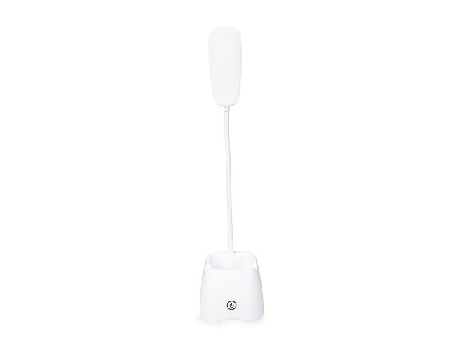 Descrição: Luminária recarregável com 18 LEDs, estrutura em plástico e haste articulável em múltiplos ângulos. Possui base com porta-canetas e acionamento por toque para a seleção de três níveis diferentes de iluminação. Acompanha cabo Micro USB para recarga.
