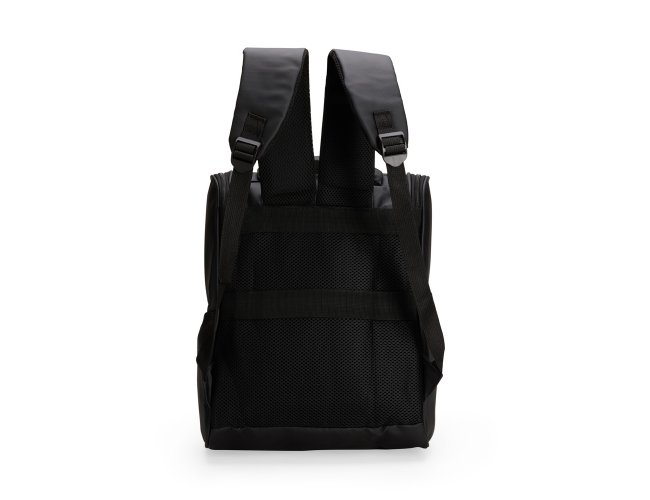 Descrição: Mochila confeccionada em couro sintético impermeável com capacidade de até 18 litros. Possui compartimento interno para notebook de até 13 polegadas. Apresenta compartimento frontal com par de fivelas e fechamento em botões magnéticos, além de dois bolsos laterais. Possui área das costas e alças de mão e de costas com revestimento em tecido respirável.