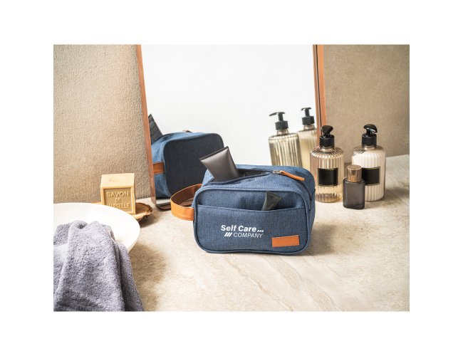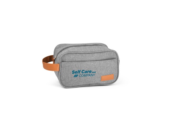 Bolsa de cosméticos em 600D de alta densidade e pega em PU. Contém bolso frontal com zíper e placa em PU. 220 x 130 x 130 mm