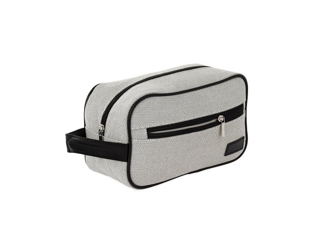 Descrição: Nécessaire confeccionada em lona e fechamento em zíper. Possui bolso frontal e compartimento principal com três bolsos internos, além de alça lateral e plaquinha costurada em couro sintético.