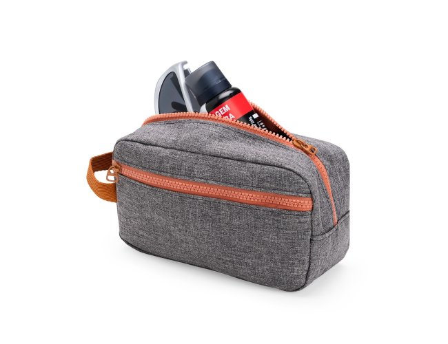 Descrição: Nécessaire confeccionada em poliéster resistente à água e fechamento em zíper. Além do compartimento principal, dispõe de bolso frontal externo e alça lateral de mão em nylon.
