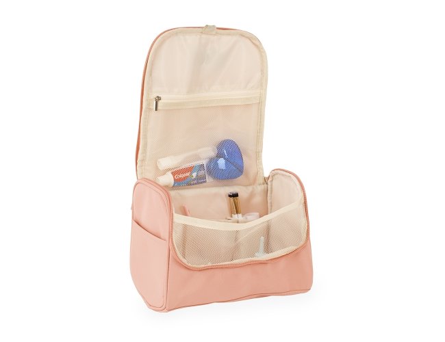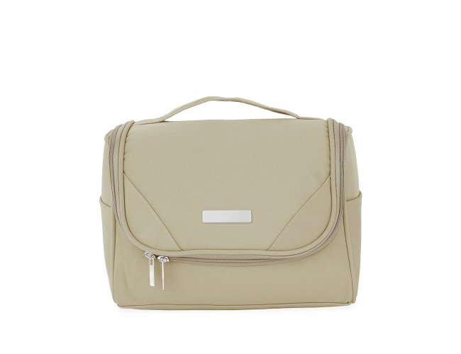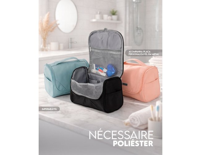 Descrição: Nécessaire organizadora confeccionada em poliéster impermeável. Conta com bolso interno em tela de nylon com fechamento em zíper, três bolsos abertos e gancho plástico para mantê-la pendurada quando aberta. Acompanha placa personalizável em metal.