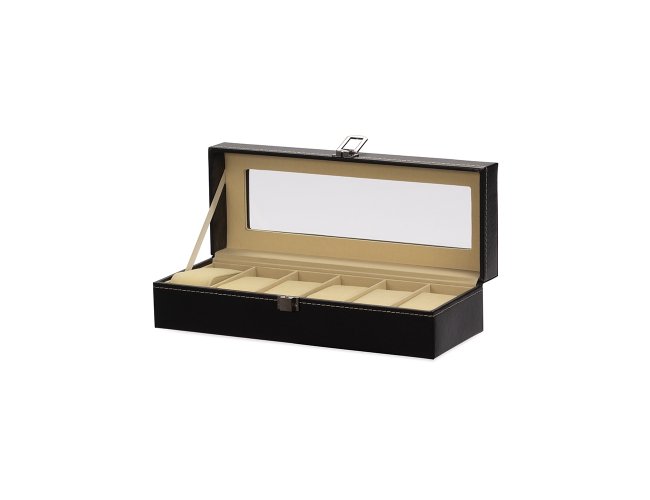 Descrição: Porta-relógios com acabamento em couro sintético e interior revestido em veludo. Possui seis divisórias com almofadas removíveis, tampa com visor em acrílico e abertura em 90 graus, facilitando a visualização e o manuseio dos acessórios. Conta com trava de segurança para fechamento do estojo.