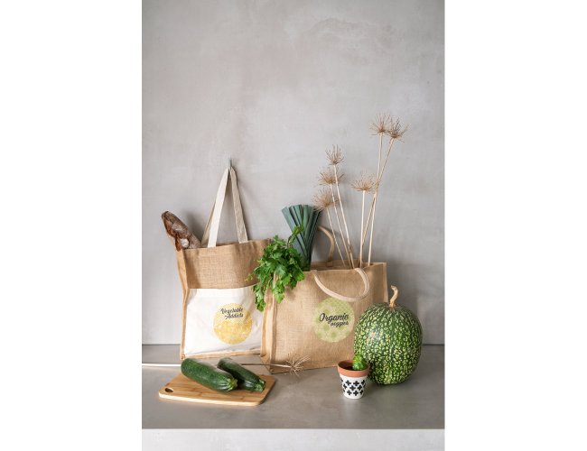 Sacola. Juta: 240 g/m². Bolso frontal 100% algodão: 140 g/m². Alças de 65 cm.